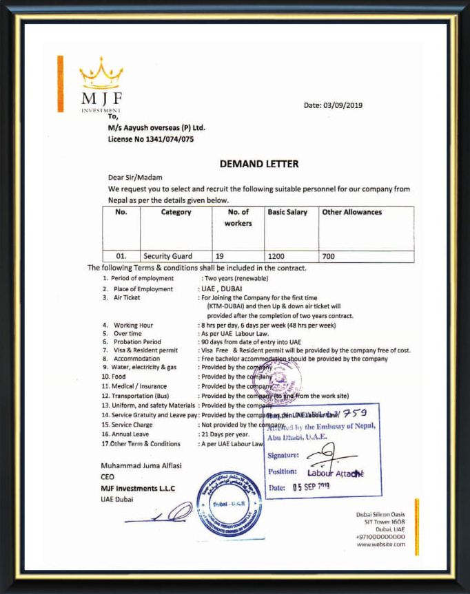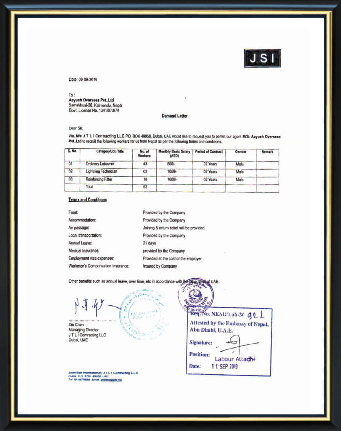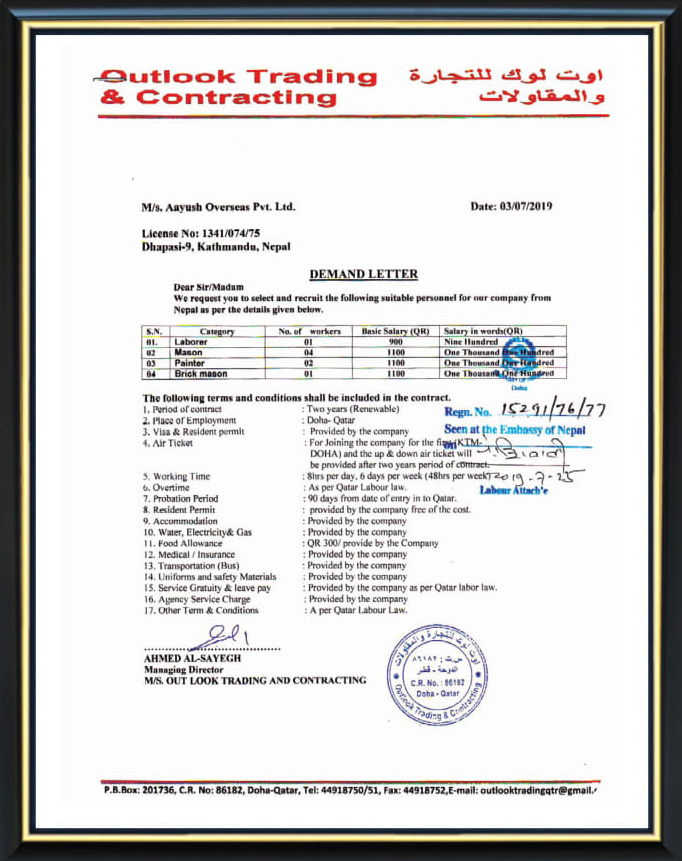 It is a matter of our great pleasure to introduce Aayush Overseas Pvt. Ltd. as one of the leading human resources supplier agencies in Nepal. The company is dedicated to provide highly skilled, skilled, semi skilled and unskilled manpower to support the human resources of the companies around the world.